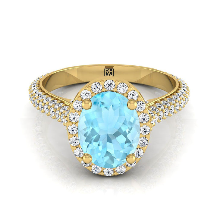 แหวนหมั้นทองคำเหลือง 18K รูปไข่อะความารีนไมโครปาเว่ ฮาโลว์ พร้อมเพชรข้างแบบปาเว่ - 7/8ctw