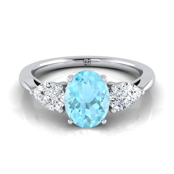 แหวนหมั้นเพชรสามเม็ดรูปทรงลูกแพร์ที่เข้าคู่กันอย่างสมบูรณ์แบบ ประกอบด้วยอควอมารีนรูปไข่ทองคำขาว 14K - 7/8 กะรัตรวม
