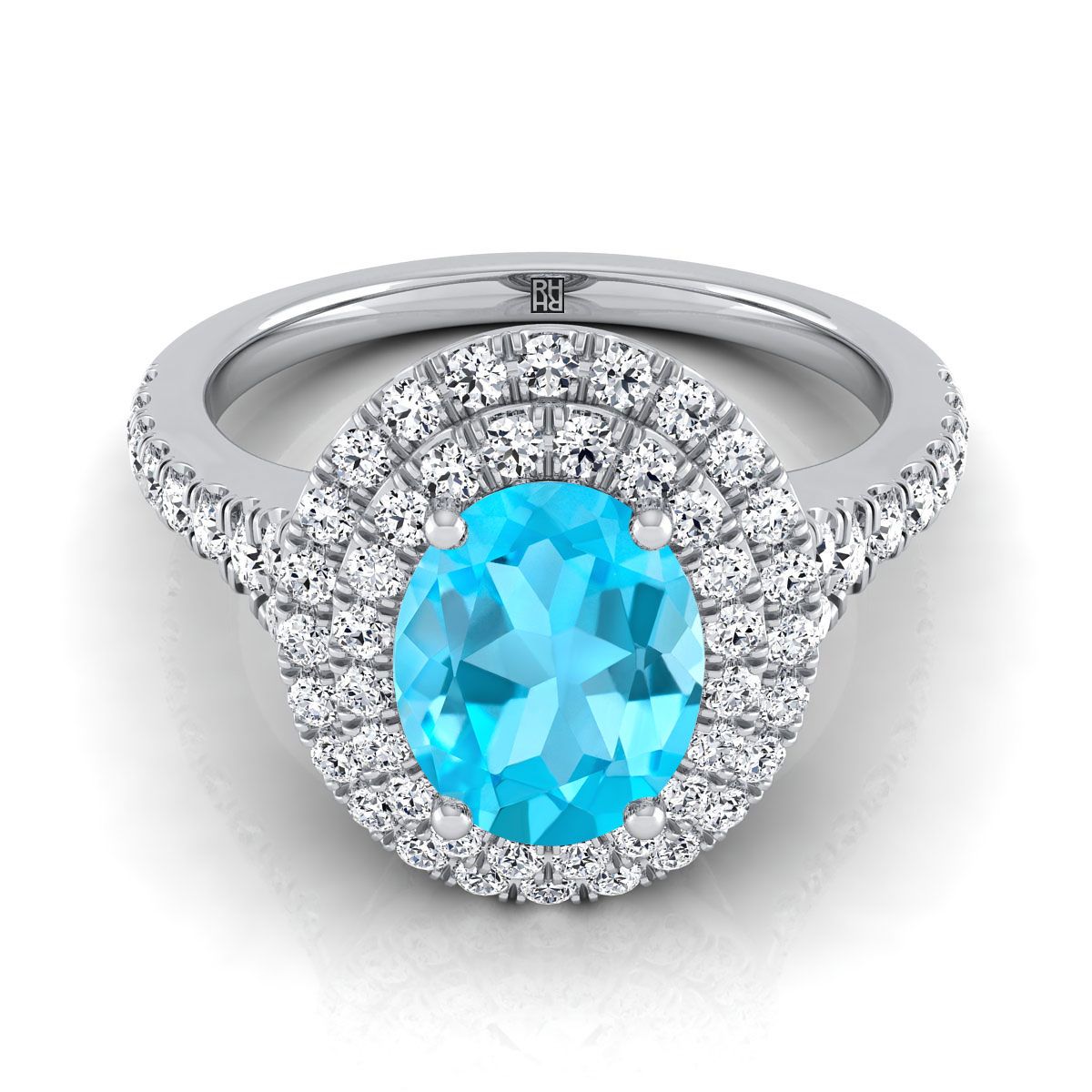แหวนหมั้นทองคำขาว 18K รูปไข่ ประดับทับทิมสวิสสีน้ำเงิน พร้อมวงแหวนสองชั้นและเพชรปาเว่ลายหยัก - 1/2ctw