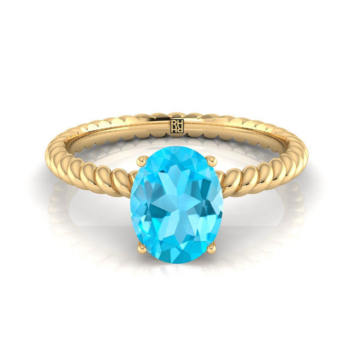 แหวนหมั้นทองคำเหลือง 18K รูปไข่ ประดับทับทิมสวิสสีน้ำเงินบลูท็อปาซแบบเกลียวเชือกเดี่ยว พร้อมเพชรเซอร์ไพรส์