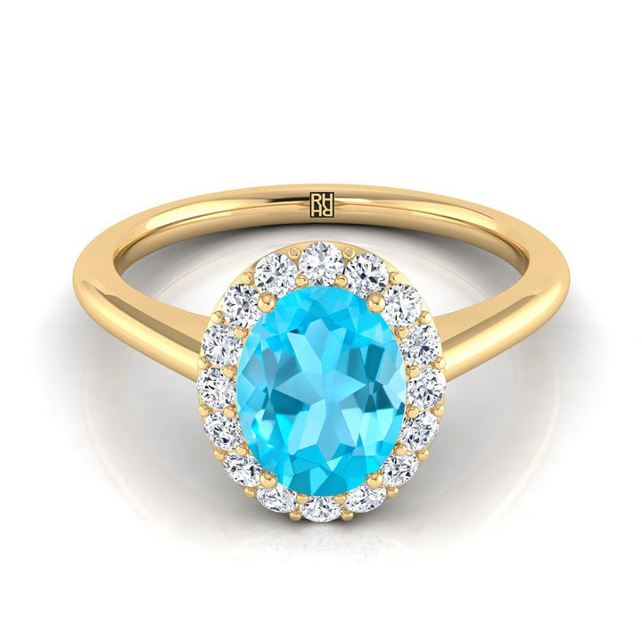 แหวนหมั้นทองคำ 14K สีเหลือง รูปวงรี ประดับทับทิมสวิสสีน้ำเงิน พร้อมเพชรล้อมแบบหนีบร่วม - 1/5 กะรัตรวม