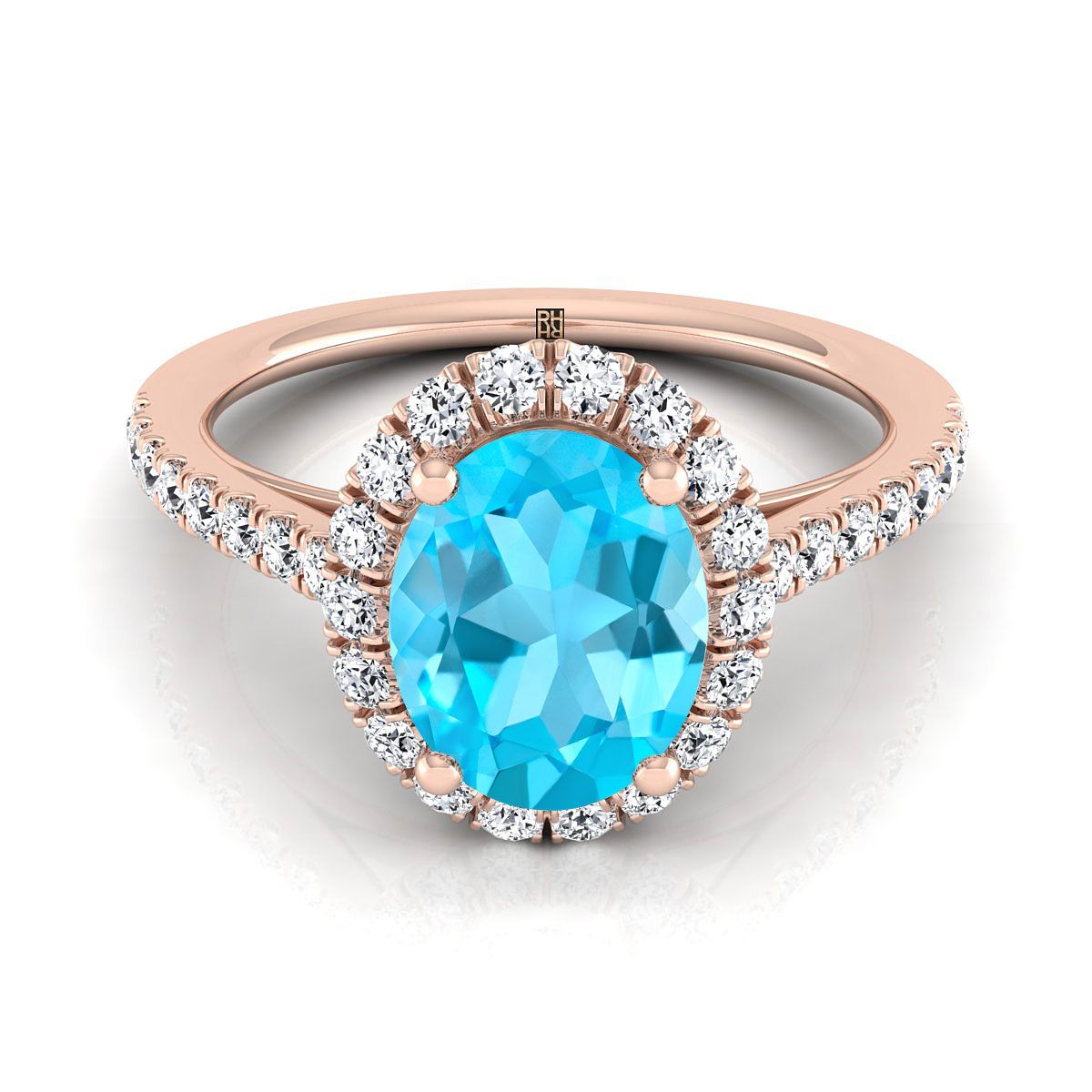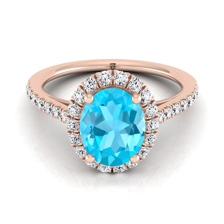 แหวนหมั้นเพชรฝรั่งเศสแบบปาเว่รูปวงรีสีฟ้าสวิสท็อปาซขนาดเล็ก 14K โรสโกลด์ - 3/8ctw