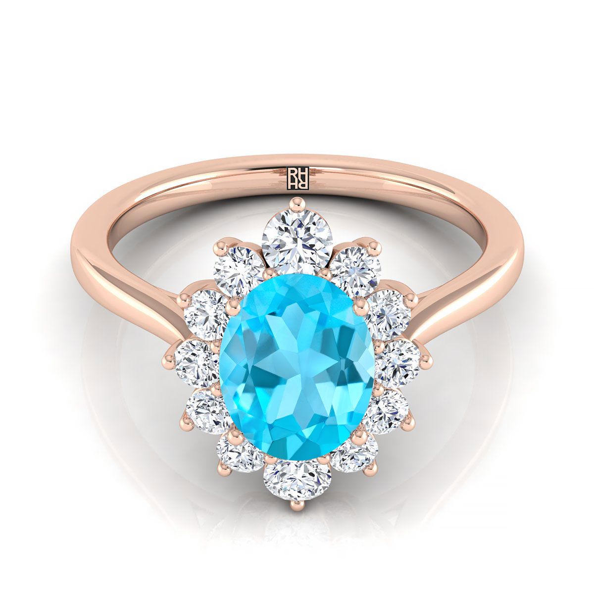 แหวนหมั้นโทแพซสวิสสีน้ำเงินรูปวงรีประดับเพชรล้อมดอกไม้ทองกุหลาบ 14K - 1/2ctw