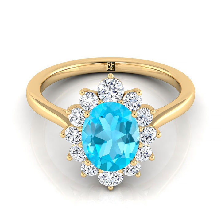แหวนหมั้นโทแพซสวิสสีน้ำเงินรูปวงรีล้อมเพชรลายดอกไม้ทองคำเหลือง 18K - 1/2ctw