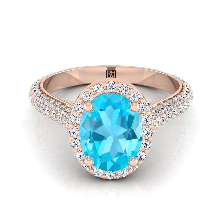 แหวนหมั้นทองคำ 14K โรสโกลด์ รูปไข่ ประดับทับทิมสวิสสีน้ำเงิน พร้อมไมโครปาเว่และเพชรข้างแบบปาเว่ - 7/8 กะรัตรวม