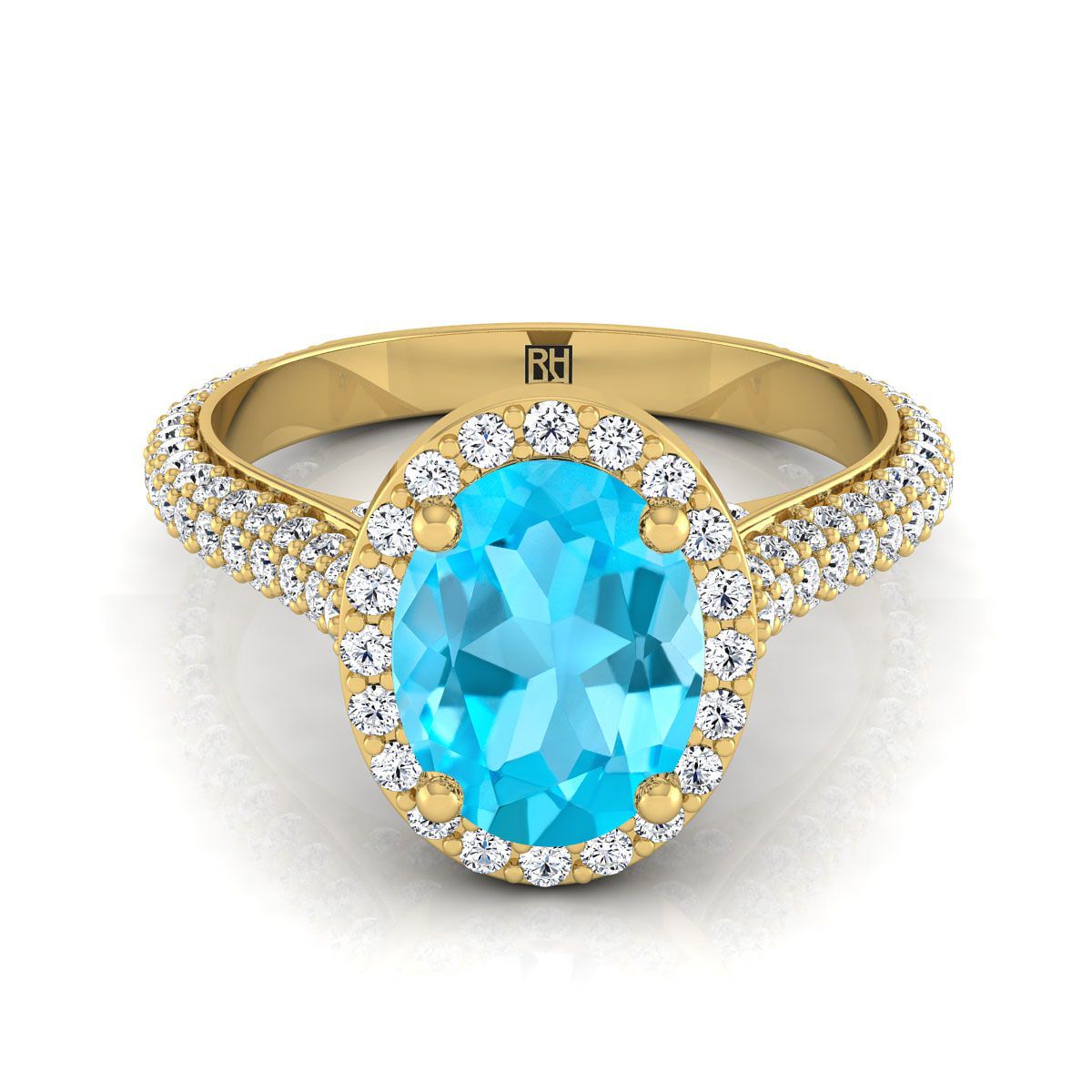 แหวนหมั้นทองคำเหลือง 14K รูปวงรี ประดับทับทิมสวิสสีน้ำเงินไมโครปาเว่ พร้อมฮาโลรอบเม็ดเพชรข้างแบบปาเว่ - 7/8ctw