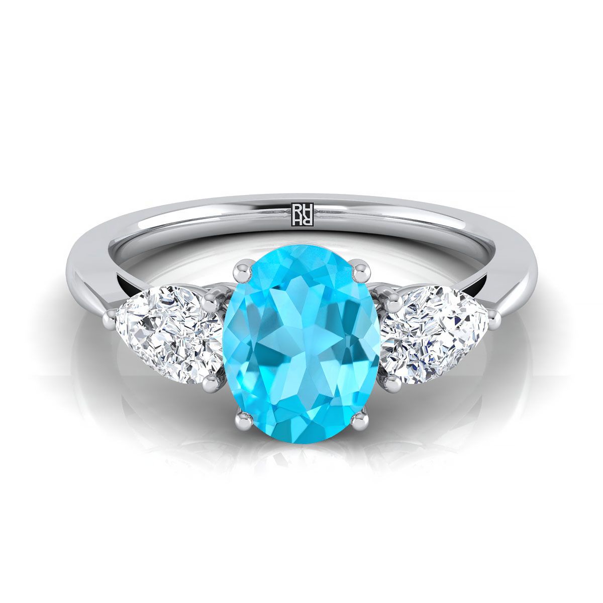 แหวนหมั้นเพชรสามเม็ดรูปทรงลูกแพร์ที่เข้าคู่กันอย่างสมบูรณ์แบบ ประดับด้วยทับทิมสวิสสีน้ำเงินรูปวงรีทองคำขาว 18K - 7/8ctw