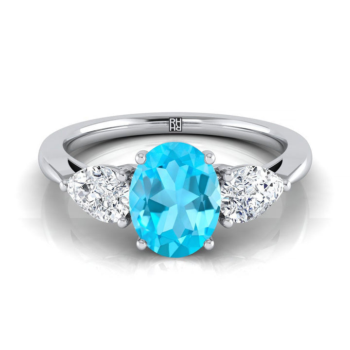 แหวนหมั้นเพชรสามเม็ดรูปทรงลูกแพร์ที่เข้าคู่กันอย่างสมบูรณ์แบบ ประดับด้วยทับทิมสวิสสีน้ำเงินรูปวงรีแพลทินัม - 7/8 กะรัตรวม