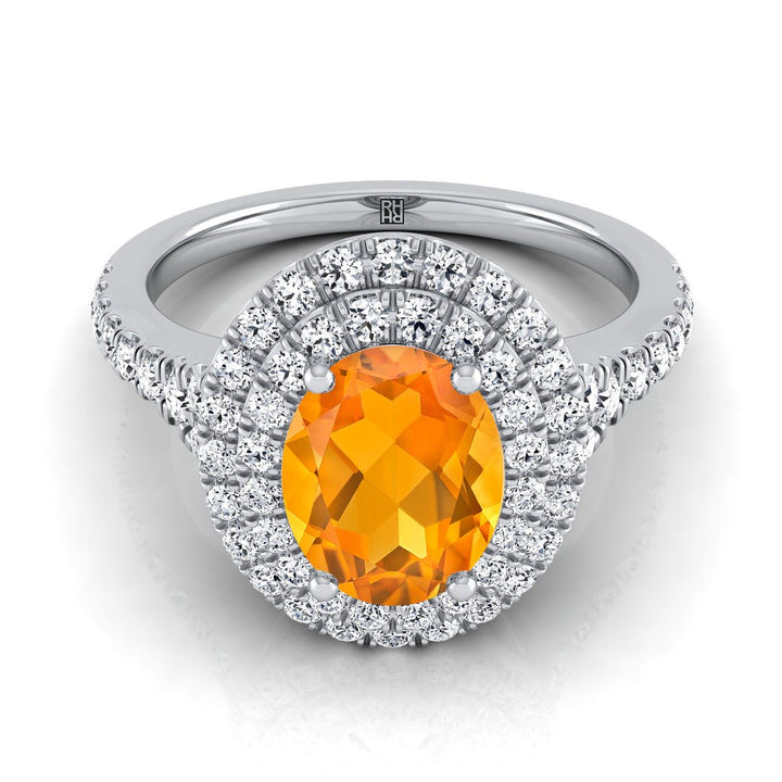 แหวนหมั้นเพชรแบบดับเบิลฮาโลรูปวงรีประดับซิทรินทองคำขาว 14K พร้อมเพชรปาเว่ขอบหยัก - 1/2ctw