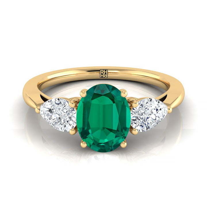 แหวนหมั้นเพชรสามเม็ดรูปทรงลูกแพร์ที่เข้าคู่กันอย่างสมบูรณ์แบบ ประกอบด้วยมรกตรูปไข่ทองคำเหลือง 14K - 7/8 กะรัตรวม