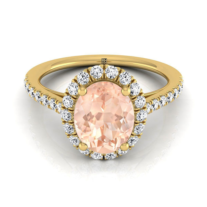 แหวนหมั้นทองคำเหลือง 14K รูปไข่ มอร์กาไนต์ขนาดเล็ก ฮาโลว์ฝรั่งเศสเพชรปาเว่ -3/8ctw