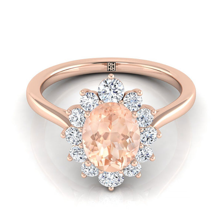 แหวนหมั้นทองคำชมพู 14k พร้อมเพชรกลางมอร์แกไนต์รูปไข่ขนาด 8 x 6 มม. และเพชรเจียระไนแบบ Brilliant Cut 12 เม็ด น้ำหนักรวม 0.48 กะรัต