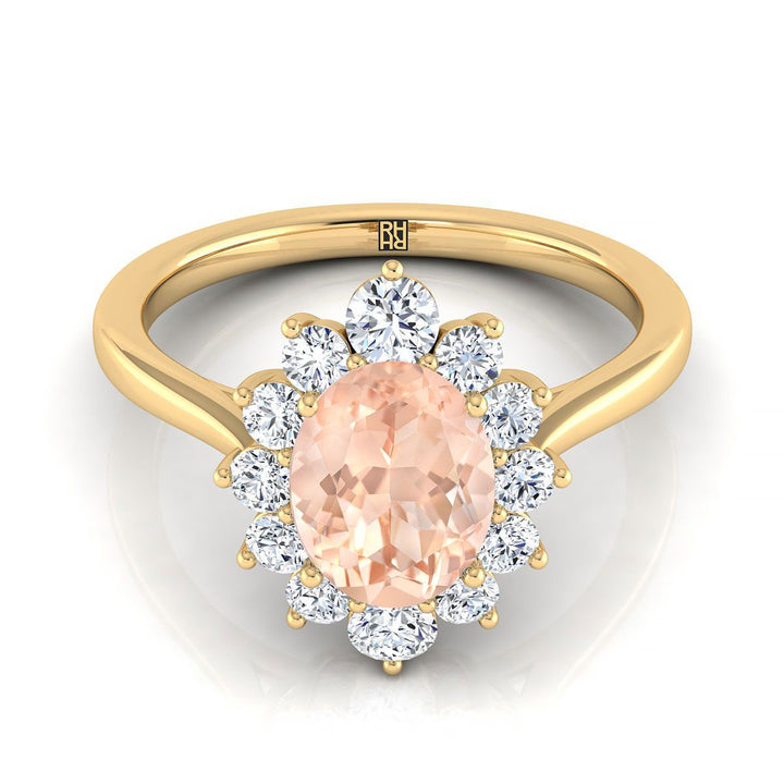 แหวนหมั้นทองคำ 14 กะรัต สีเหลือง พร้อมเพชรเจียระไนแบบ Brilliant Cut 12 เม็ด น้ำหนักรวม 0.48 กะรัต และมอร์กาไนต์รูปไข่ขนาด 8 x 6 มม. เป็นเม็ดกลาง