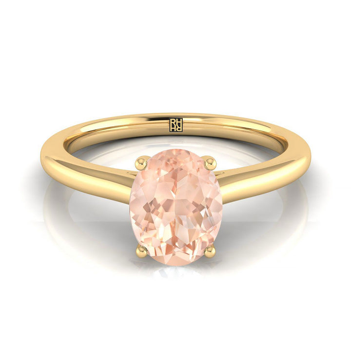 แหวนหมั้นทองคำเหลือง 18k พร้อมด้วยหินมอร์แกไนต์รูปไข่ขนาด 8 x 6 มม. ที่ศูนย์ และการตั้งแบบวิหาร พร้อมก้านแหวนครึ่งวงกลม