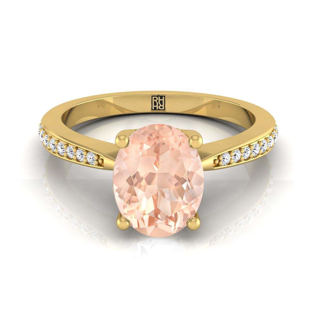 แหวนหมั้นทองคำ 14k สีเหลือง พร้อมด้วยหินมอร์แกไนต์ทรงรีขนาด 8 x 6 มม. ที่ศูนย์กลาง และเพชรทรงกลมเจียระไนแบบ Brilliant จำนวน 20 เม็ด น้ำหนักรวม 0.125 กะรัต