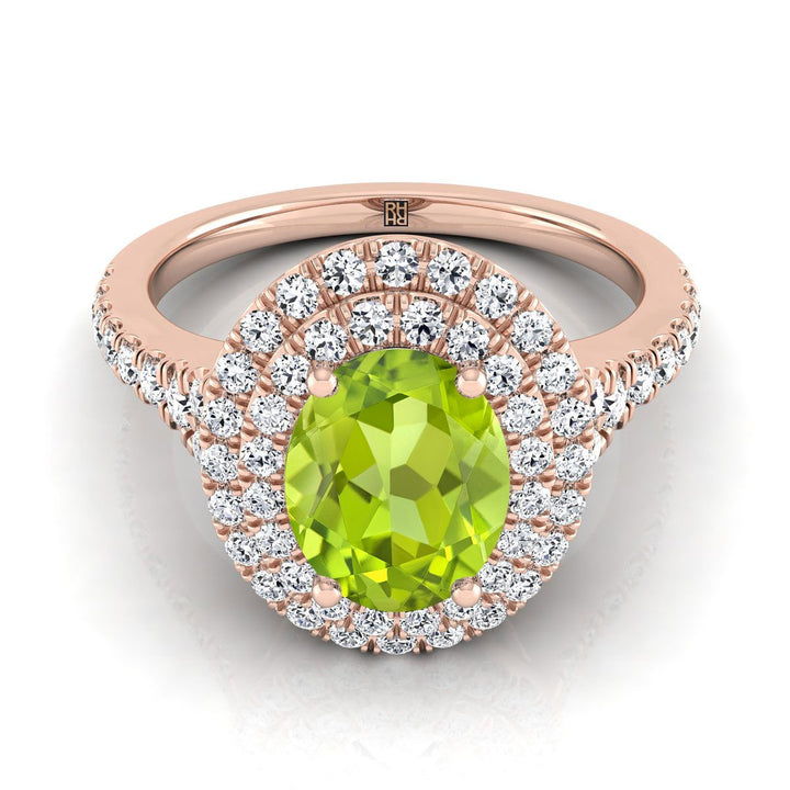 แหวนหมั้นเพชรแบบดับเบิลฮาโลรูปวงรีประดับเพอริดอตทองกุหลาบ 14K พร้อมเพชรปาเว่ขอบหยัก - 1/2ctw