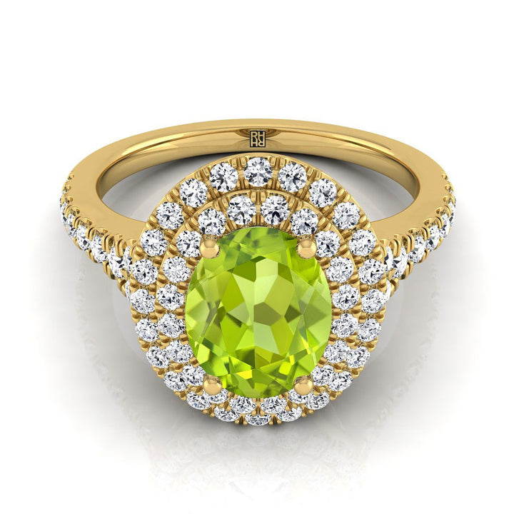 แหวนหมั้นเพชรแบบดับเบิลฮาโลรูปไข่ประดับเพอริดอตสีเขียวทองคำเหลือง 18K พร้อมเพชรปาเว่ขอบหยัก - 1/2ctw