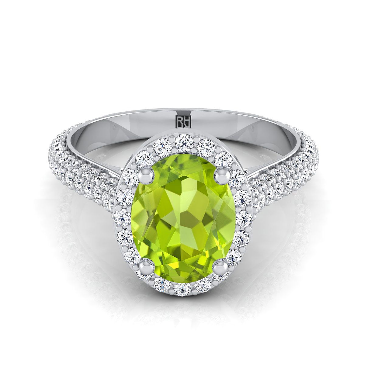 แหวนหมั้นทองคำขาว 18K รูปไข่ประดับเพอริดอตไมโครปาเว่ ฮาโลว์ พร้อมเพชรข้างแบบปาเว่ - 7/8 กะรัตรวม