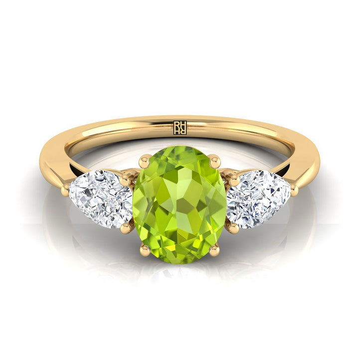 แหวนหมั้นเพชรสามเม็ดรูปทรงลูกแพร์ที่เข้าคู่กันอย่างสมบูรณ์แบบ ประดับเพอริดอตรูปวงรีทองคำเหลือง 18K - 7/8ctw
