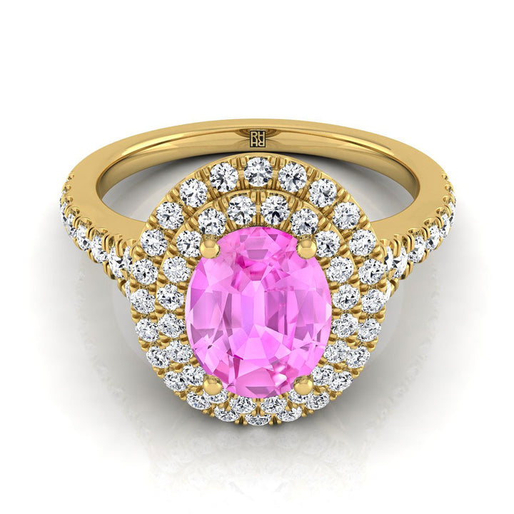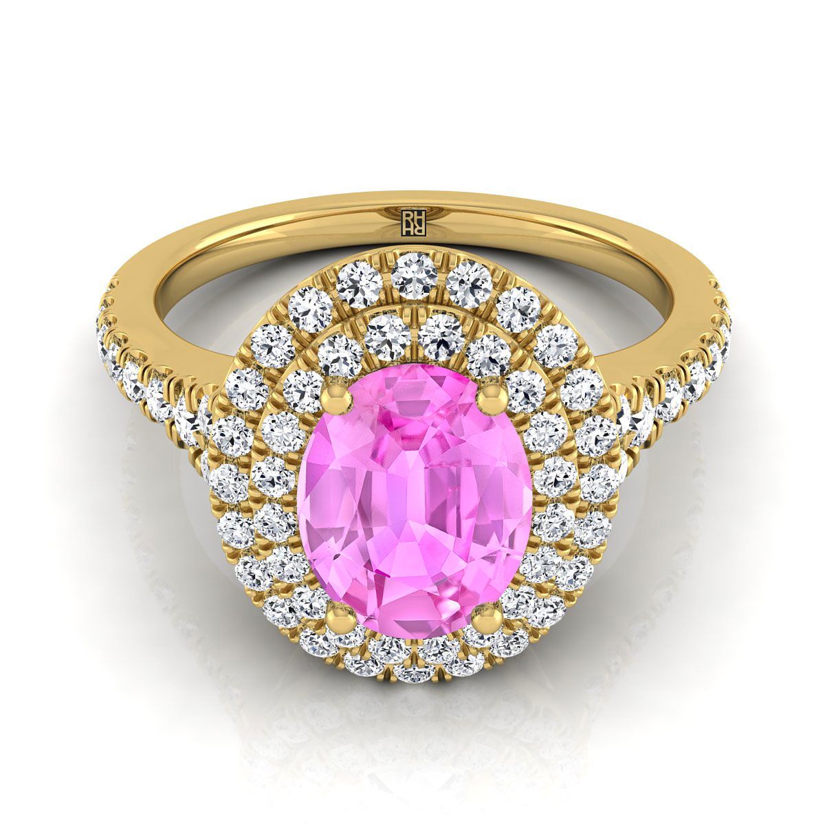 แหวนหมั้นทองคำเหลือง 18K รูปไข่ประดับแซฟไฟร์สีชมพู พร้อมวงแหวนคู่แบบฮาโล่และเพชรปาเว่ขอบหยัก - 1/2ctw