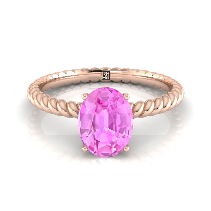 แหวนหมั้นทองคำชมพู 14k พร้อมพลอยไพลินสีชมพูทรงรีขนาด 8 x 6 มม. ที่ศูนย์กลาง และดีไซน์สายเชือก
