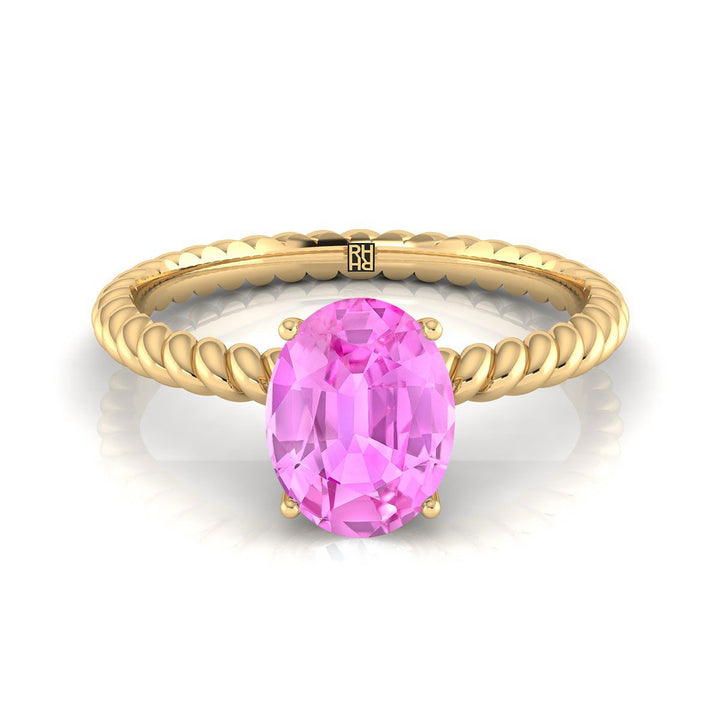 แหวนหมั้นทองคำเหลือง 18K รูปไข่ประดับแซฟไฟร์สีชมพูแบบเกลียวเชือกเดี่ยวพร้อมเพชรเซอร์ไพรส์