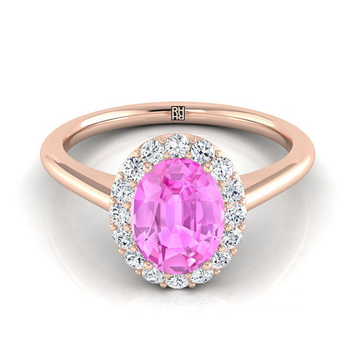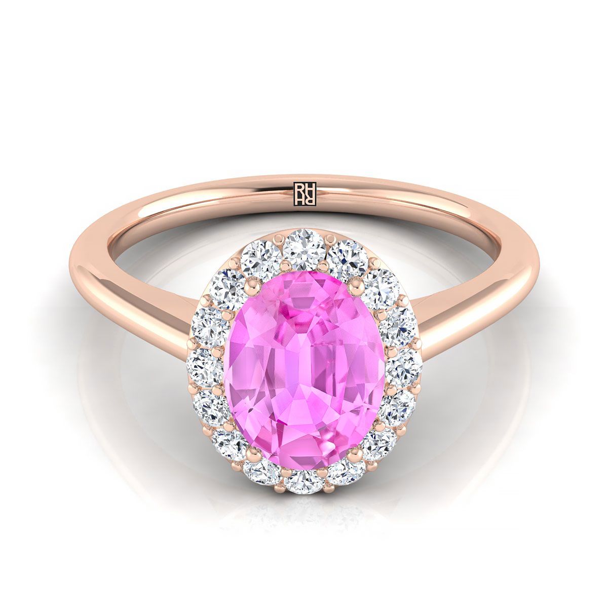 แหวนหมั้นทองคำ 14K ชมพูแซฟไฟร์รูปวงรีแบบก้านร่วมพร้อมเพชรฮาโลขนาด 1/5 กะรัต