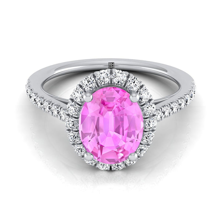 แหวนหมั้นเพชรฝรั่งเศสแบบพาเว่ทรงวงรีประดับแซฟไฟร์สีชมพูขนาดเล็ก 14K ทองคำขาว - 3/8ctw