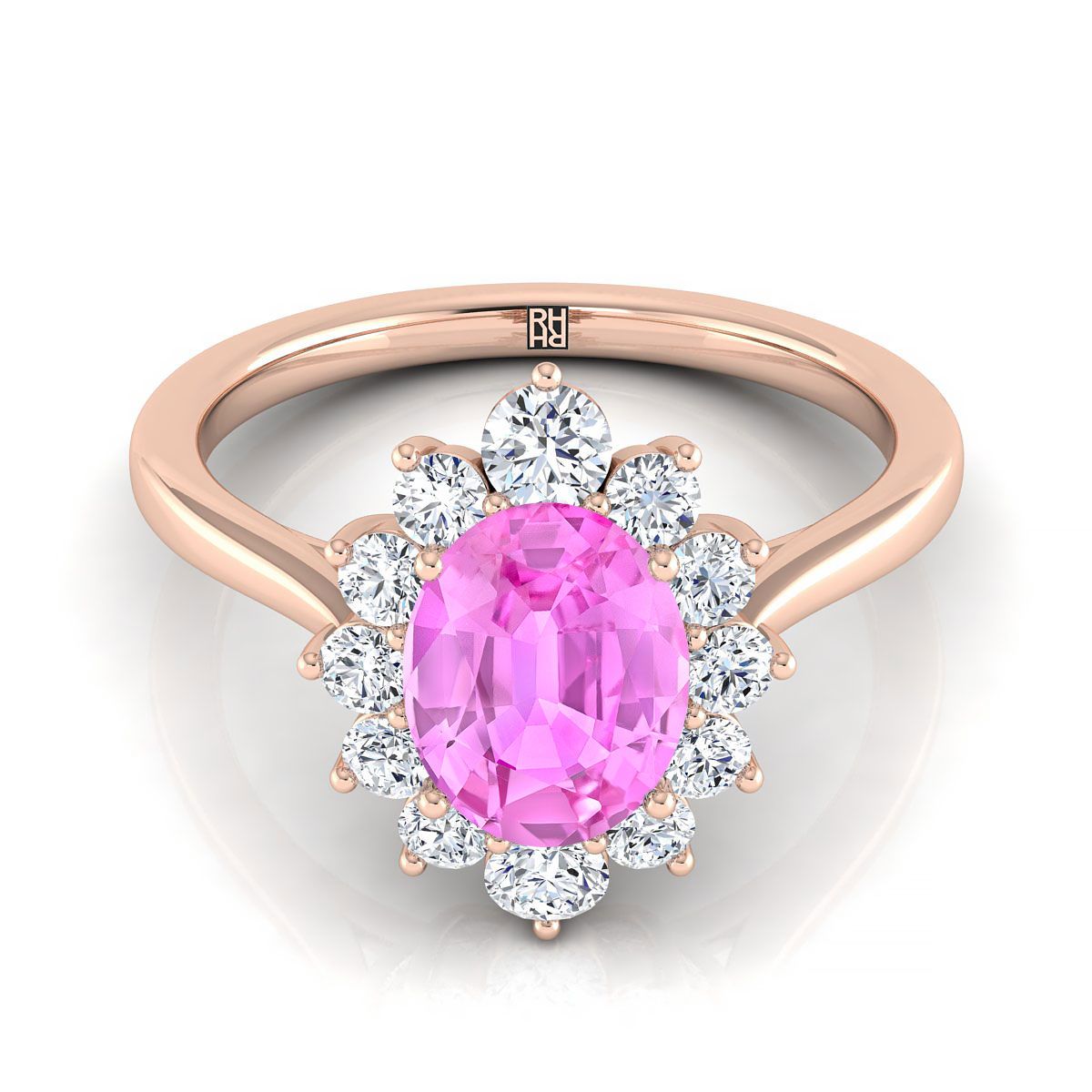 แหวนหมั้นโทนสีทองกุหลาบ 14K รูปวงรี ประดับด้วยไพลินสีชมพูและเพชรล้อมดอกไม้ - 1/2ctw