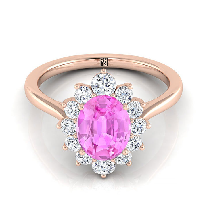 แหวนหมั้นทองคำชมพู 14k พร้อมพลอยไพลินสีชมพูรูปไข่ขนาด 8 x 6 มม. ตรงกลาง และเพชรเจียระไนแบบ Brilliant Cut 12 เม็ด น้ำหนักรวม 0.48 กะรัต