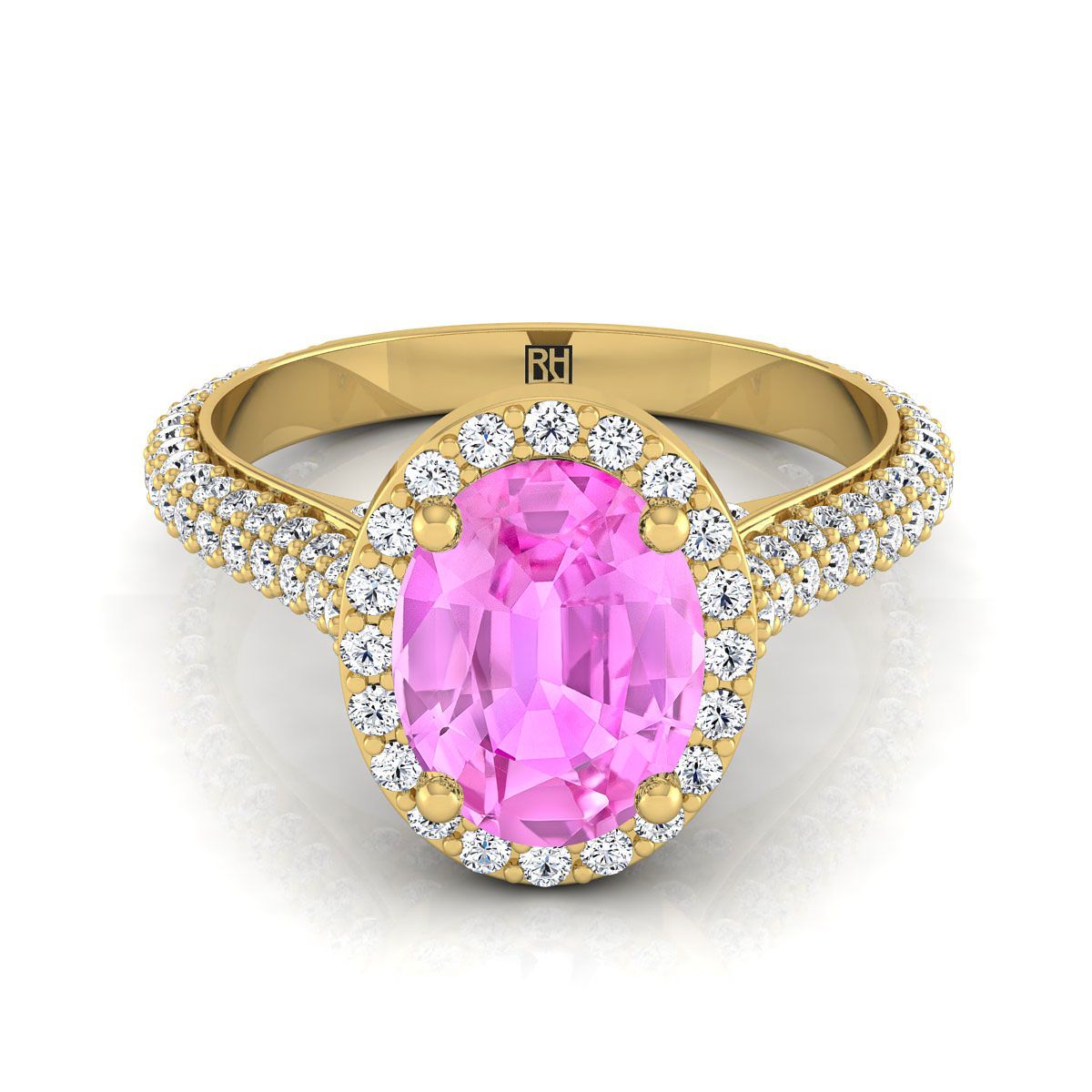 แหวนหมั้นทองคำ 14K สีเหลือง รูปไข่ ประดับแซฟไฟร์สีชมพูไมโครปาเว่ พร้อมฮาโล่และเพชรข้างแบบปาเว่ - 7/8 กะรัตรวม