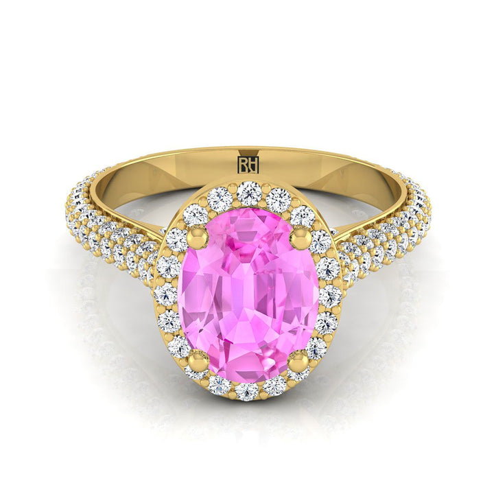 แหวนหมั้นทองคำเหลือง 18K รูปไข่ประดับแซฟไฟร์สีชมพูไมโครปาเว่ พร้อมฮาโลรอบและเพชรข้างแบบปาเว่ - 7/8ctw