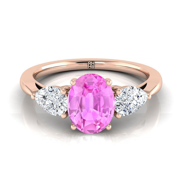 แหวนหมั้นเพชรสามเม็ดรูปทรงลูกแพร์ที่เข้าคู่กันอย่างสมบูรณ์แบบ ประกอบด้วยแซฟไฟร์สีชมพูรูปวงรีทองกุหลาบ 14K น้ำหนักรวม 7/8 กะรัต