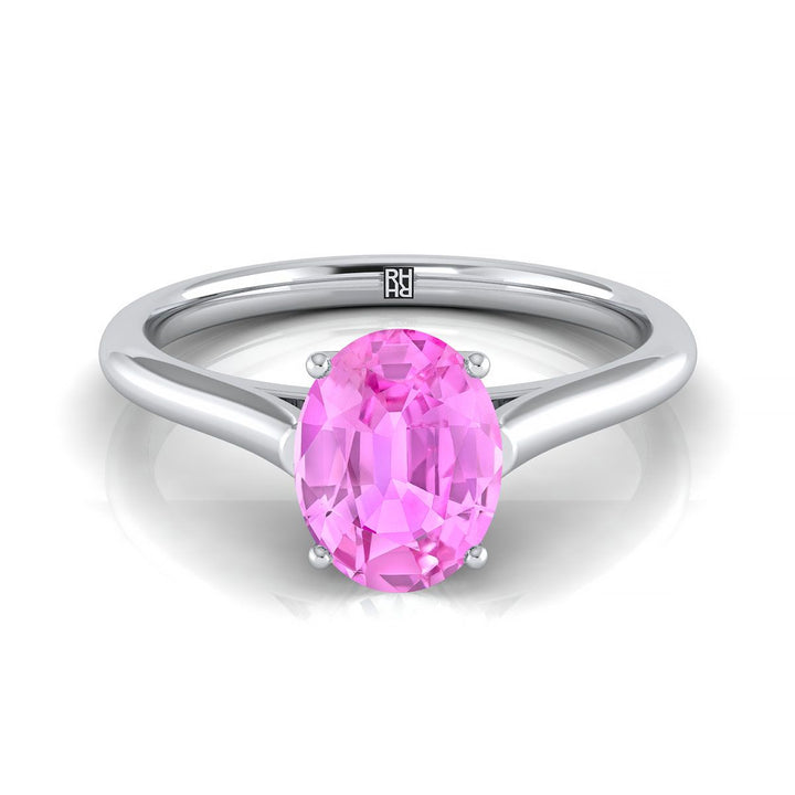 แหวนหมั้นเดี่ยวสไตล์วิหาร รูปไข่ พลอยไพลินสีชมพู ทองคำขาว 18K แบบสวมใส่สบาย