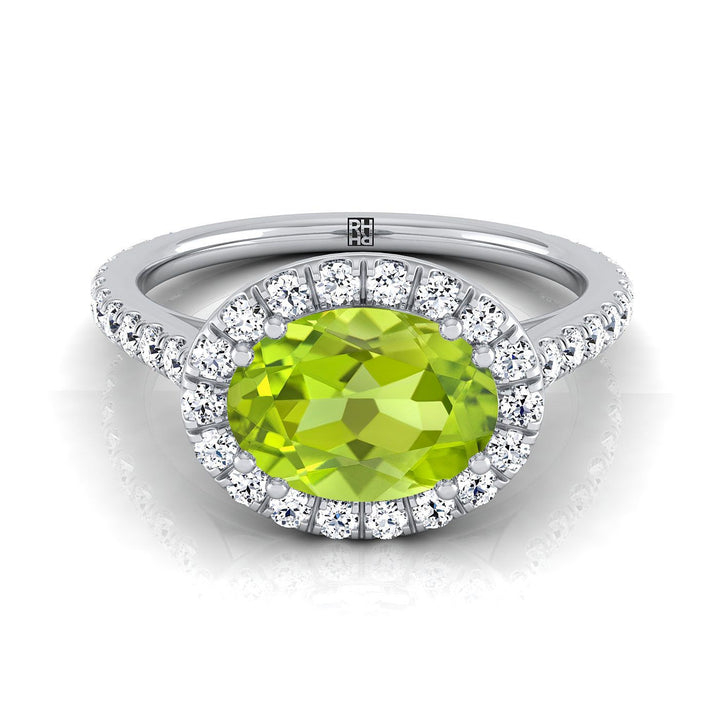 แหวนหมั้นเพชรแบบวงแหวนล้อมเพชรทรงรีเพอริดอตสีเขียวทองคำขาว 18K แนวนอนสไตล์แฟนซีทิศตะวันออก-ตะวันตก - 1/2ctw