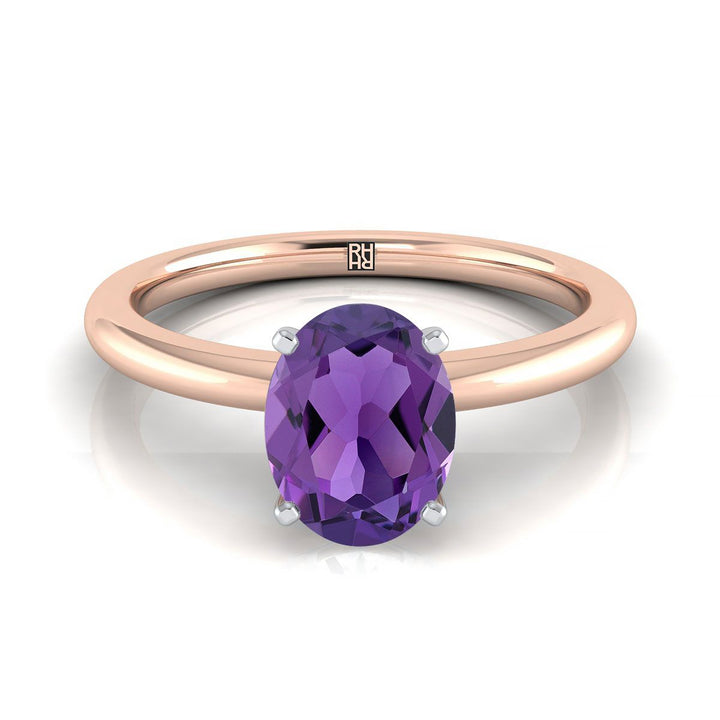 แหวนหมั้นทองคำชมพู 14k พร้อมอเมทิสต์รูปไข่ขนาด 8 x 6 มม. ที่ศูนย์กลาง และแหวนวงโค้งมนพร้อมการตั้งเม็ดหินแบบ 4 ก้าน