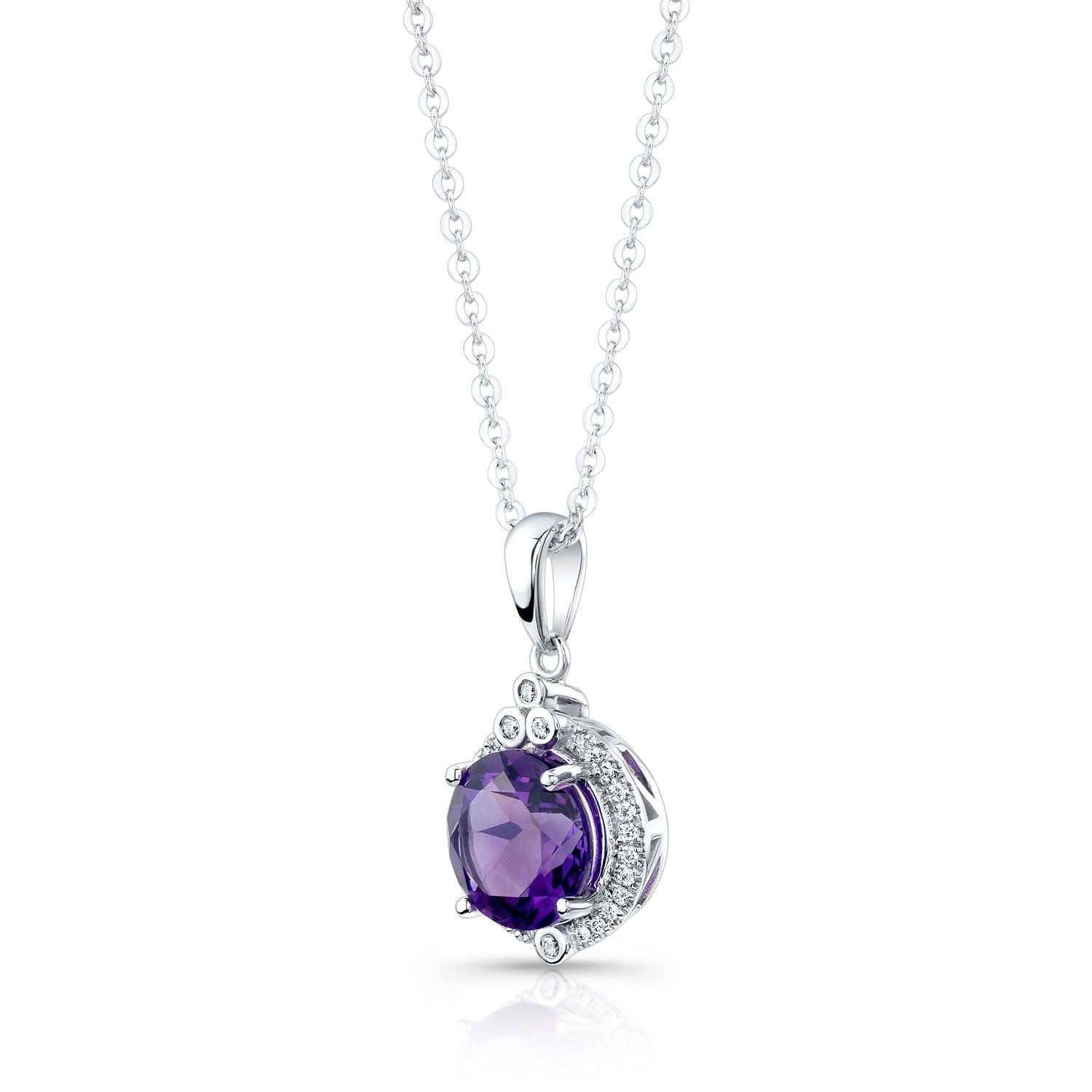 ทองคำขาว 14 กะรัต พร้อมอเมทิสต์ทรงกลมขนาด 9 มม. 1 เม็ด และเพชรทรงกลมเจียระไนแบบ Brilliant 32 เม็ด น้ำหนักรวม 1/10 กะรัต บนสร้อยโซ่โรโล่ยาว 18 นิ้ว