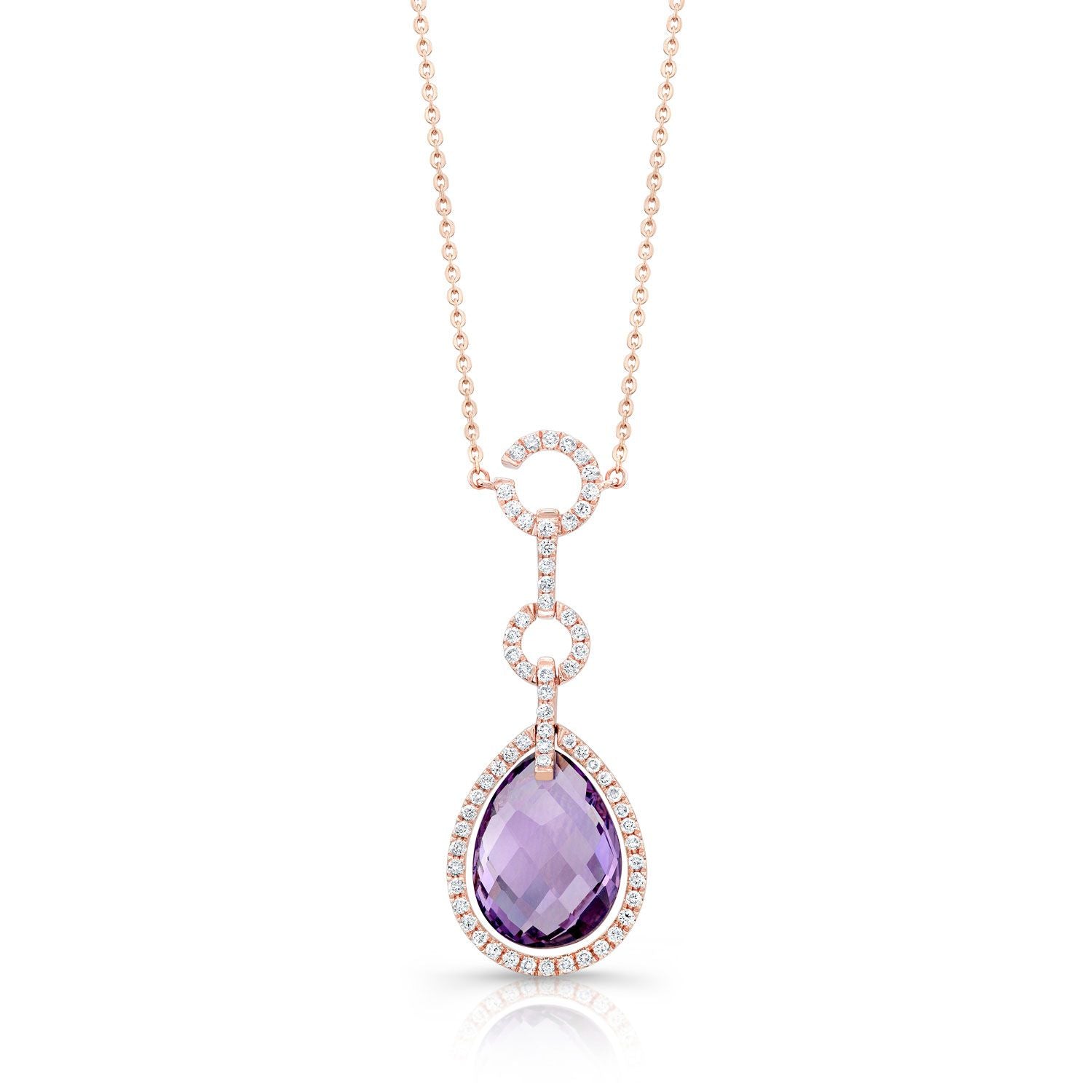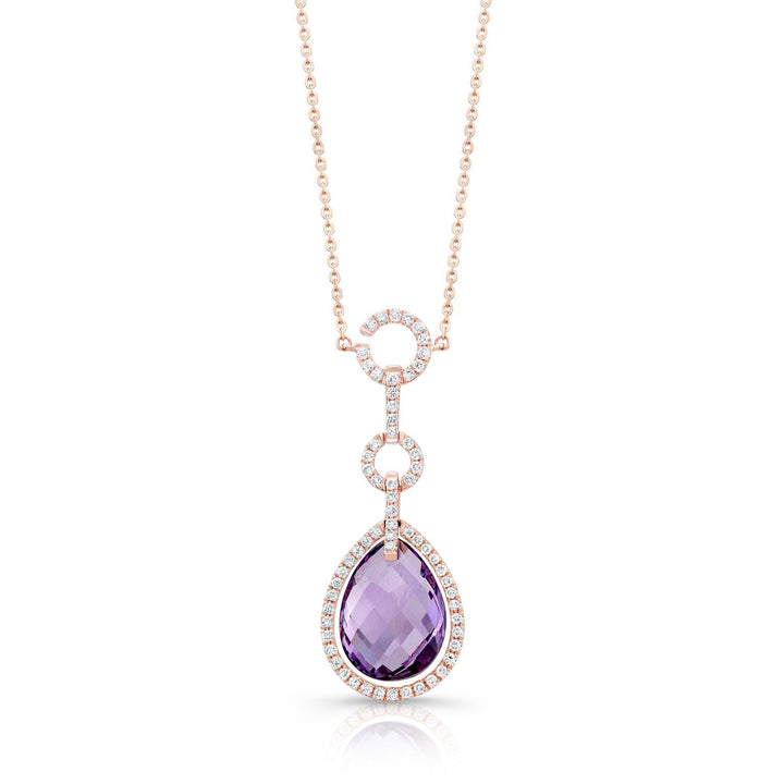 จี้ทองคำชมพู 14k พร้อมอเมทิสต์รูปทรงลูกแพร์แบบตารางหมากรุกขนาด 15x11 มม. (6.25 กะรัต) และเพชรทรงกลมเจียระไนแบบ Brilliant จำนวน 64 เม็ด น้ำหนักรวม 0.50 กะรัต บนสายสร้อยยาว 16 นิ้ว