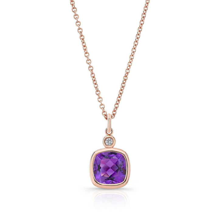 จี้ทองคำชมพู 14k พร้อมอเมทิสต์ทรงหมอนขนาด 8 มม. (1.85 กะรัตรวม) และเพชรทรงกลมเจิดจ้าหนึ่งเม็ด น้ำหนัก 0.02 กะรัต รวมสายเคเบิลปรับความยาวได้ 16-18 นิ้ว