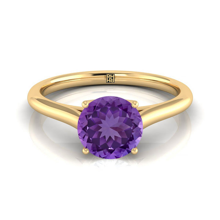 แหวนหมั้นเดี่ยวแบบคอมฟอร์ตฟิตสไตล์วิหารประดับอเมทิสต์ทรงกลมเจียระไนแบบบริลเลียนต์ทองคำเหลือง 18K
