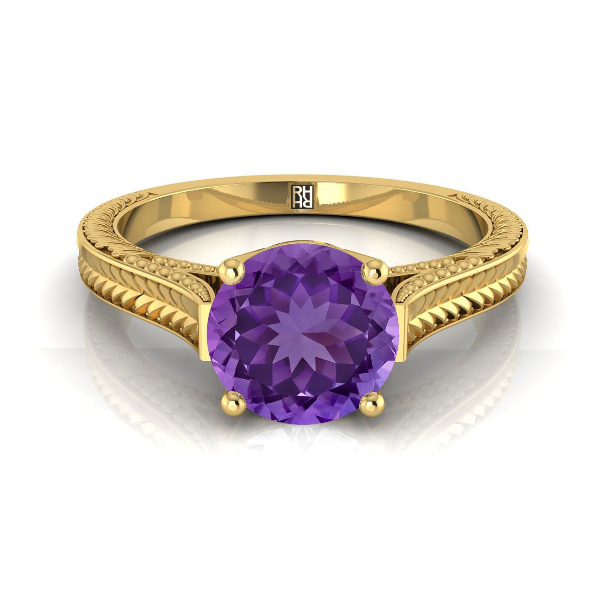 แหวนหมั้นเดี่ยวสไตล์วิหารวินเทจแกะสลักด้วยมือ ประกายกลมแอมะทิสต์ทองคำเหลือง 14K