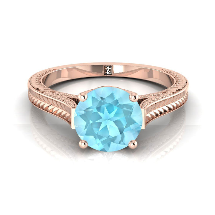 แหวนหมั้นเดี่ยวสไตล์วิกตอเรียนโบสถ์แกะสลักด้วยมือประดับอความารีนทรงกลมเจียระไนแบบบริลเลียนต์ทองกุหลาบ 14K