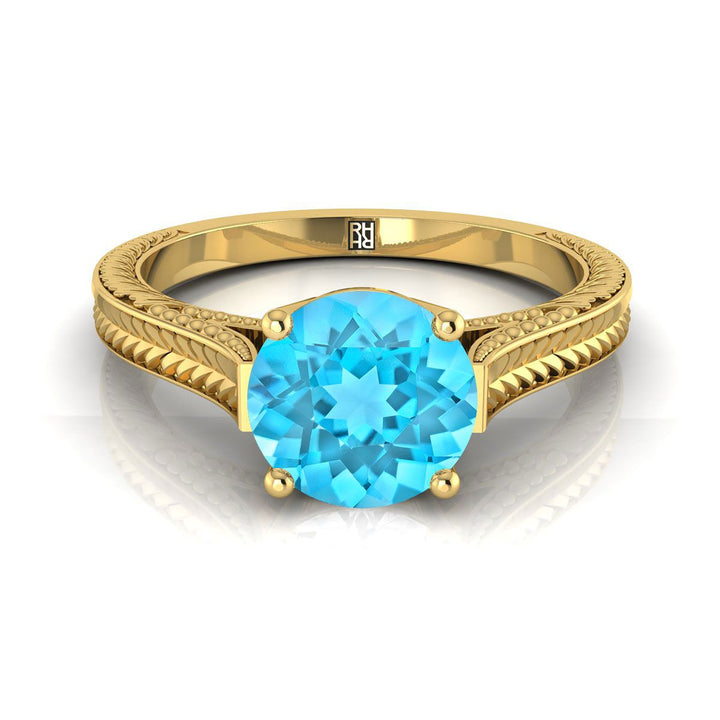 แหวนหมั้นเดี่ยวสไตล์วิหารวินเทจแกะสลักด้วยมือ ประดับทับทิมสวิสสีน้ำเงินทรงกลมเจียระไนแบบบริลเลียนต์ ทองคำเหลือง 14K