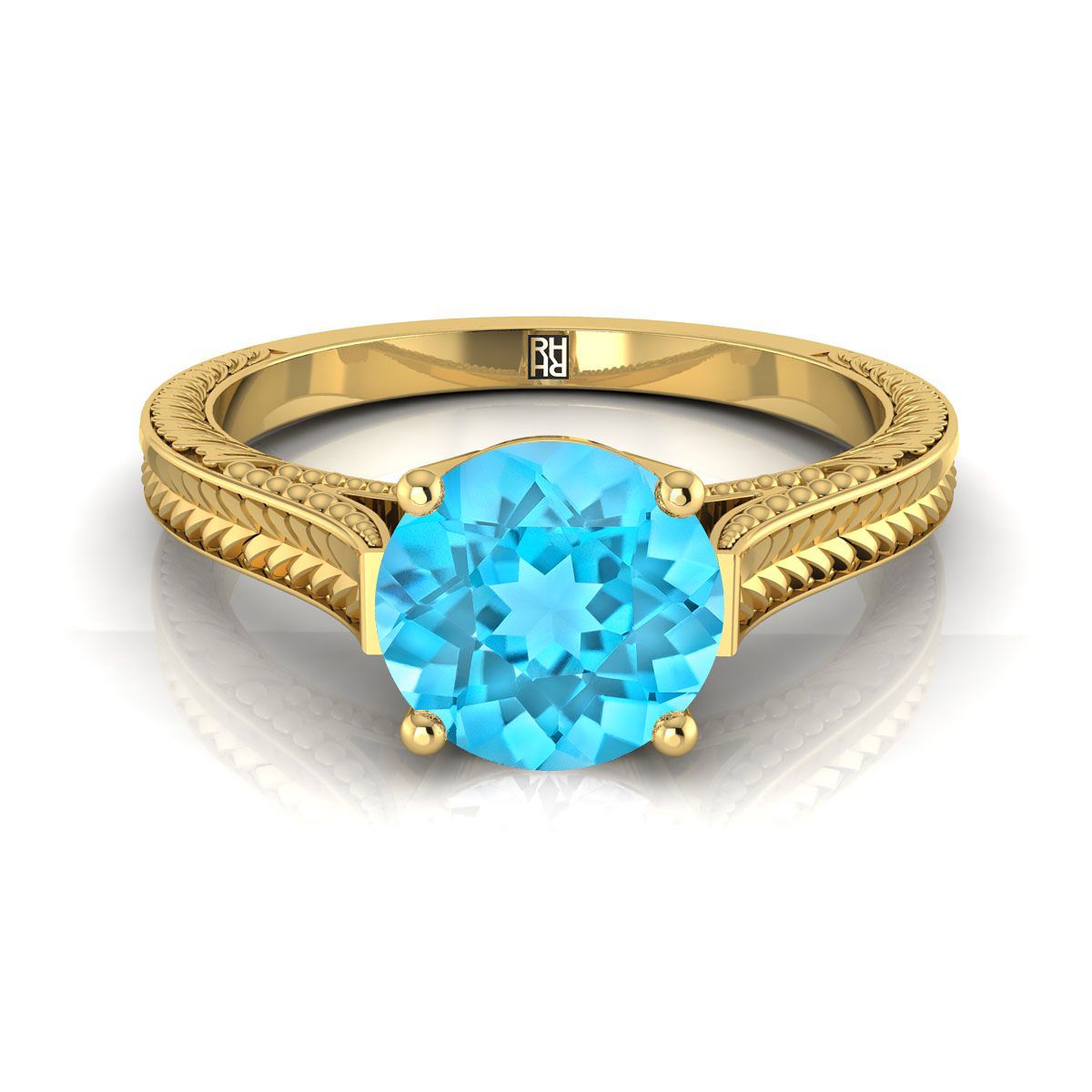 แหวนหมั้นเดี่ยวสไตล์วิหารวินเทจแกะสลักด้วยมือ ประดับทับทิมสวิสสีน้ำเงินทรงกลมเจียระไนแบบบริลเลียนต์ ทองคำเหลือง 18K