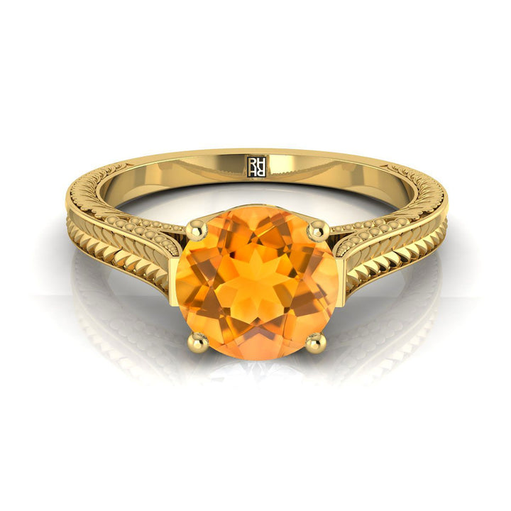แหวนหมั้นเดี่ยวสไตล์วิหารวินเทจแกะสลักด้วยมือประดับซิทรินทรงกลมเจียระไนแบบบริลเลียนต์ทองคำเหลือง 18K