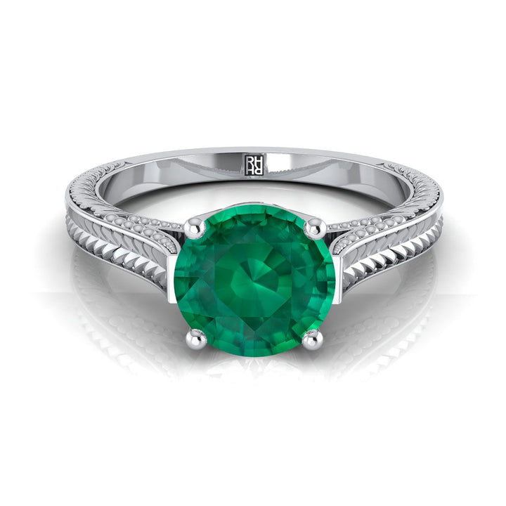 แหวนหมั้นเดี่ยวสไตล์วิหารวินเทจแกะสลักด้วยมือรูปทรงกลมเจียระไนแบบบริลเลียนท์มรกตทองคำขาว 14K