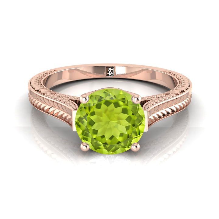 แหวนหมั้นเดี่ยวสไตล์วิหารวินเทจแกะสลักด้วยมือ ประดับเพชรกลมเจียระไนแบบบริลเลียนท์และเพอริดอต ทองกุหลาบ 14K