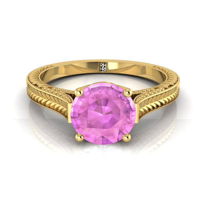 แหวนหมั้นเดี่ยวสไตล์วิหารวินเทจแกะสลักด้วยมือ ประกอบด้วยแซฟไฟร์สีชมพูทรงกลมเจียระไนแบบบริลเลียนต์ ทองคำเหลือง 14K