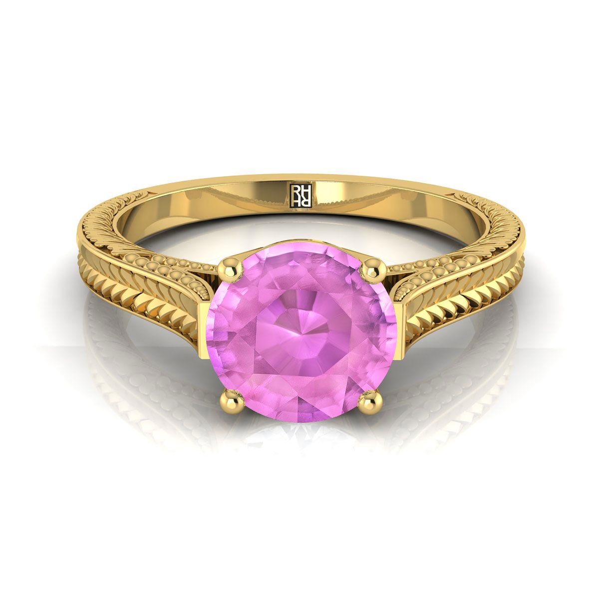 แหวนหมั้นเดี่ยวสไตล์วิหารวินเทจแกะสลักด้วยมือ ประดับแซฟไฟร์สีชมพูทรงกลมเจียระไนแบบบริลเลียนต์ ทองคำเหลือง 18K