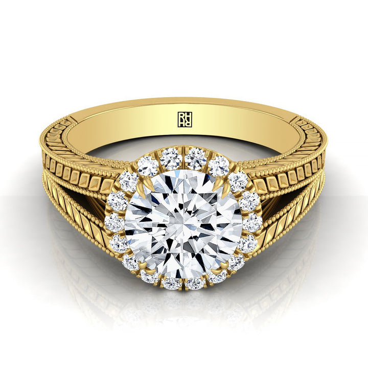 แหวนหมั้นเพชรทรงกลมเจียระไนแบบวินเทจทองคำเหลือง 14K ดีไซน์แยกช้างข้าวโพดและฮาโล